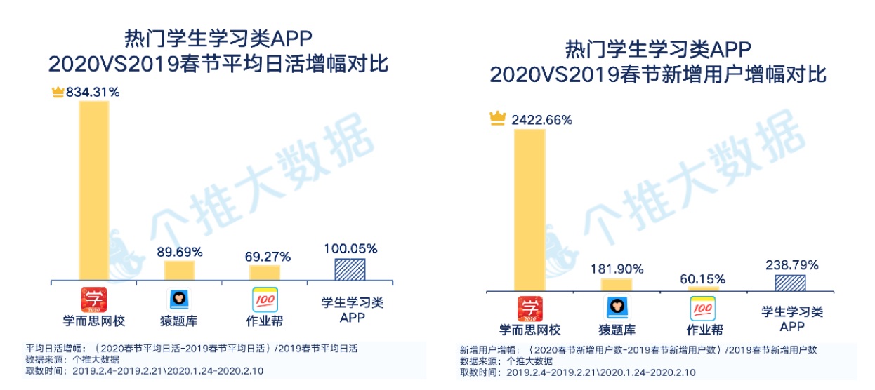 高增幅的背面,也离不开曩昔一年的堆集。上一年5月份开端,学而思、猿教导、作业帮等学生学习渠道连续推出暑期优惠贱价课程,经过“线上+线下”等方法大力推广,吸粉作用杰出。本年这个特别的假日,2.7亿学生“宅”家上课,也促进线上学习成为“刚需”。