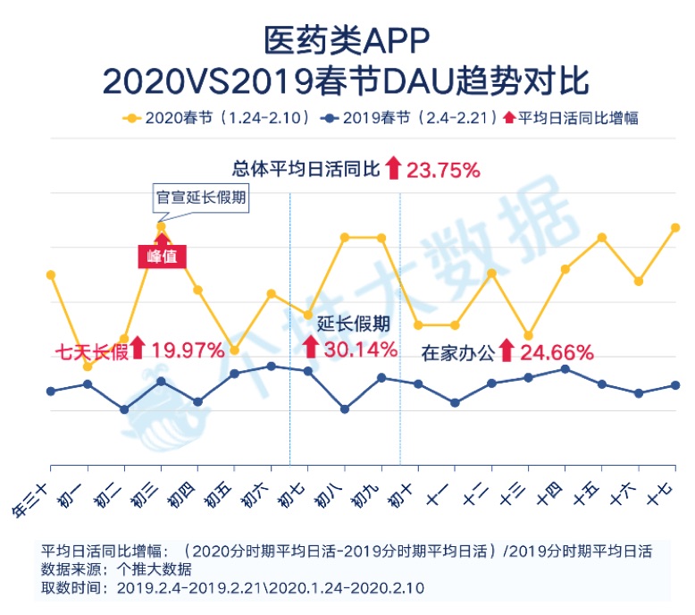 本年的新年很特别,受疫情影响,人们的学习、作业、日子从线下转到了线上。在线问诊、网购蔬菜、长途工作、在线上课成为了疫情期间人们的日常。每日互动个推大数据针对医药、生鲜、长途工作、学生学习这四类 App,侧重对 App 活泼状况和新增用户数进行了剖析,洞悉了它们在新年期间到复工后的体现。
