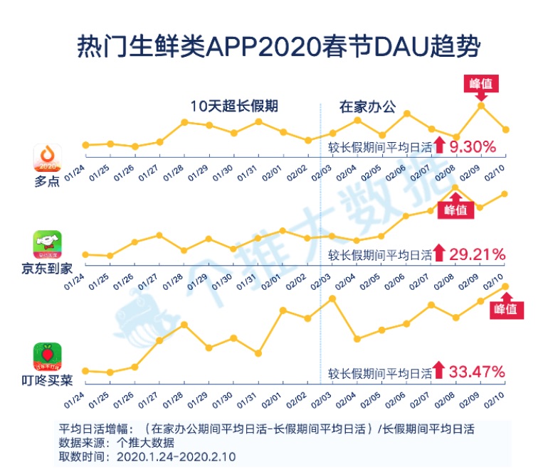 从2020新年期间日活体现来看,三个App全体均出现上升趋势,且顶峰都出现在新年后期(2月8日-10日)。比较长假日间,多点、京东到家、叮咚买菜在假日后的均匀日活别离上涨了9.30%、29.21%、33.47%。应对订单需求的暴增,叮咚买菜立异了配送形式,经过 “开轿车送菜”大大提高了人效。不少生鲜类渠道还发动了“无触摸配送服务”,既满意了顾客的多样化需求,也最大极限地保证了顾客和配送员的健康安全。
