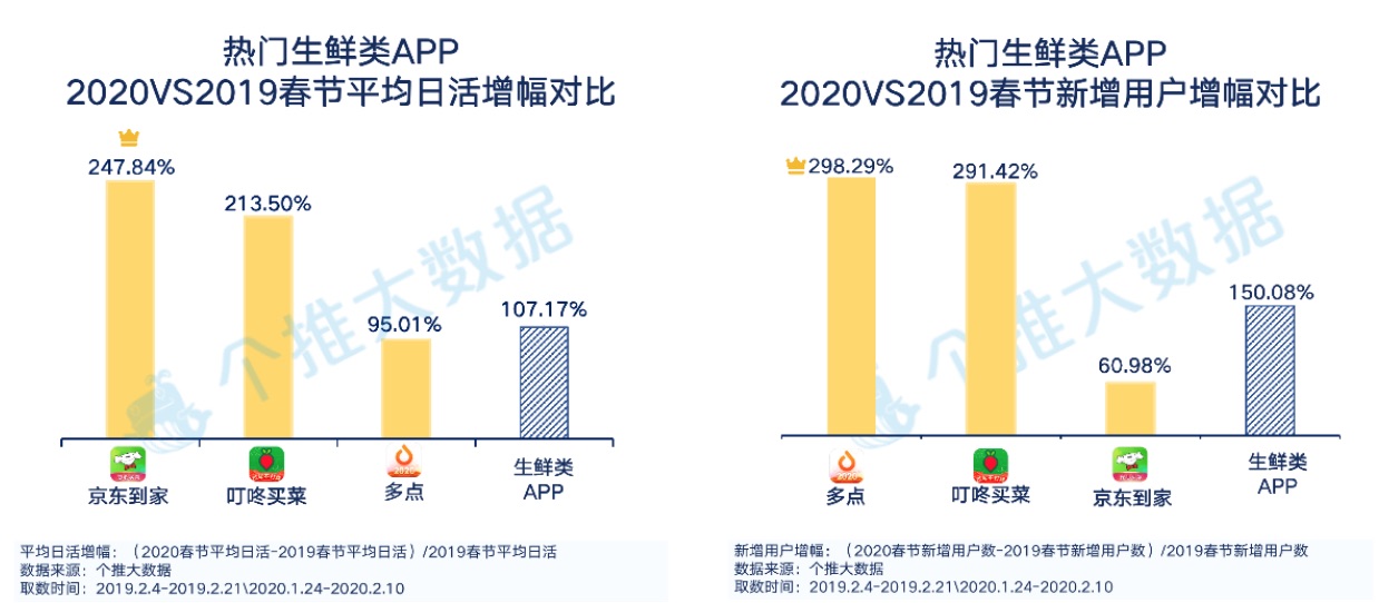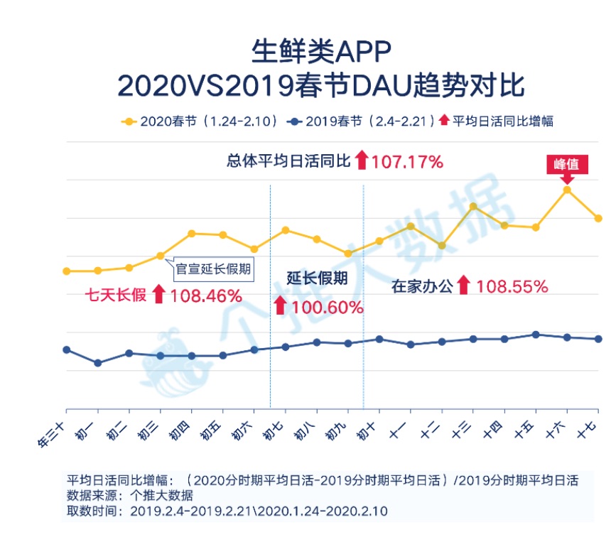 今日你买到菜了吗?”新年期间,这句话成功替代“你吃了吗”,成为新的谈天问好方法。个推大数据显现,本年新年期间生鲜类App的均匀日活同比增幅为107.17%,其间七天长假和在家工作期间别离到达了108.46%和108.55%。2019年是生鲜电商范畴快速开展的一年,高增幅的背面离不开曩昔一年的堆集。而本年受疫情的影响,多地施行居民出行管控,也必定程度上影响了生鲜类App的活泼和添加。