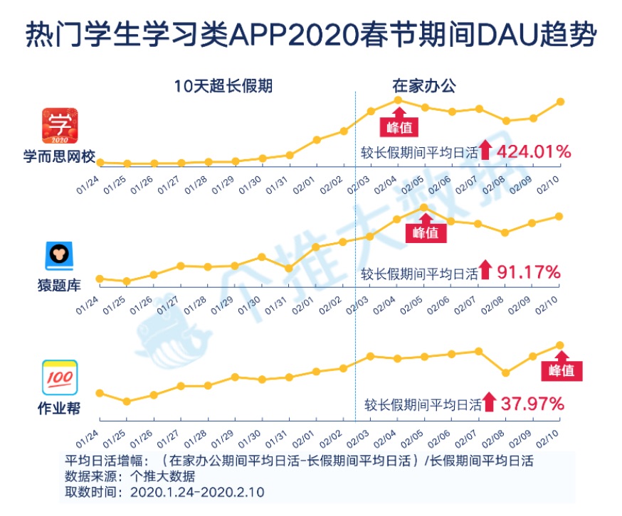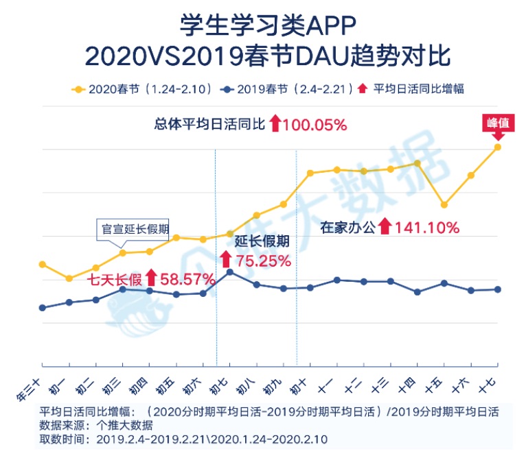 除了钉钉,各大学生学习类App也在“停课不停学”的召唤下纷繁推出免费直播课程,调动了学生居家学习的热心。个推大数据显现,本年新年学生学习类App的均匀日活增幅为100.05%,其间七天长假、延伸假日以及在家工作期间别离为58.57%、75.25%、141.10%。