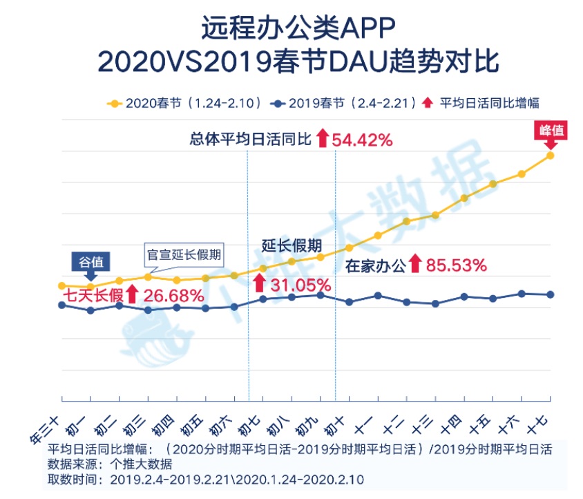 依照从前,新年七天长假之后,企事业单位开端正常复工,日常工作类App的运用频率也有所添加。而本年新年上班族们纷繁敞开“线上工作”形式,也让长途工作类App大“火”了一把。个推大数据显现,本年新年长途工作类App的均匀日活同比增幅为54.42%,其间七天长假、延伸假日、在家工作期间别离到达了26.68%、31.05%、85.53%。现在,全国各地企业依照相关方针分批逐渐复工,而不少企业还在沿袭假日时的“云工作”形式。依照这个趋势,长途工作类App的日活在短期内还会持续攀升。