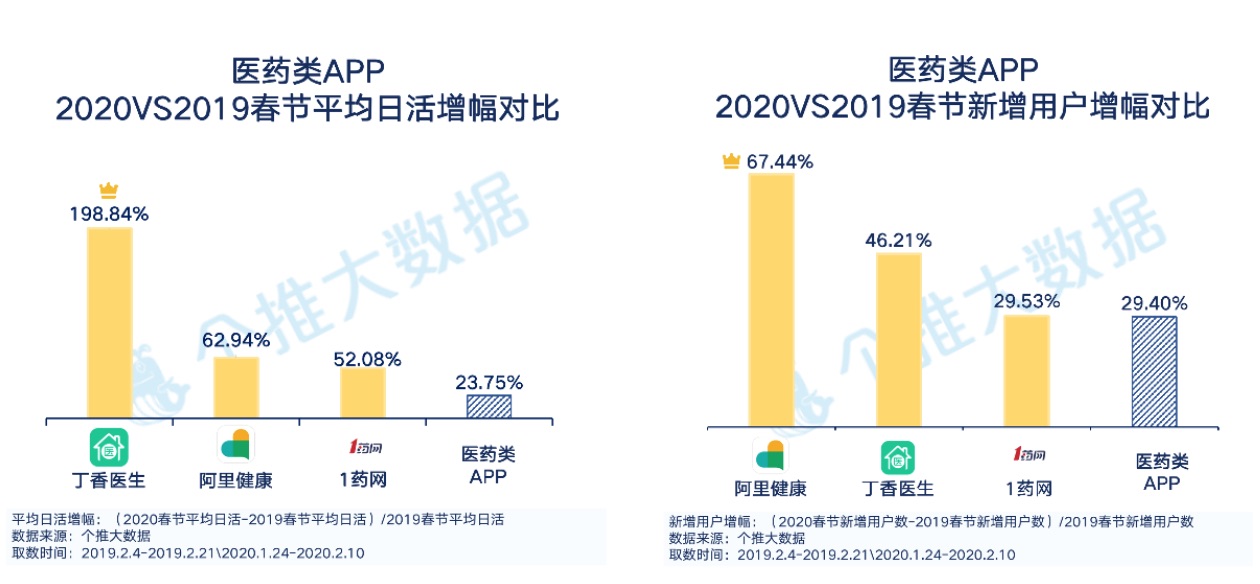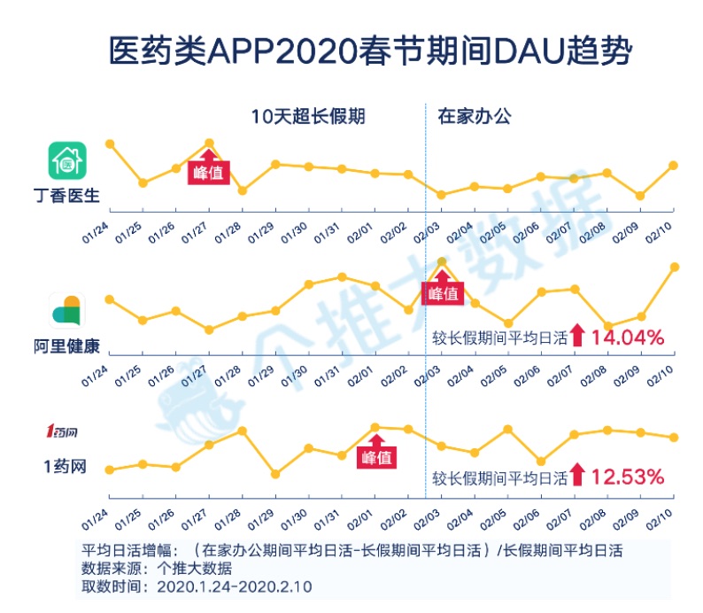 从这三个App本年新年期间的日活趋势来看,丁香医师在假日前期体现不错,这有一部分得益于丁香医师面临疫情的快速反响,首先推出了“全国新式肺炎疫情实时动态”,引起广泛重视。阿里健康和1药网在假日后有显着提高,均匀日活较长假日间别离添加14.04%和12.53%。