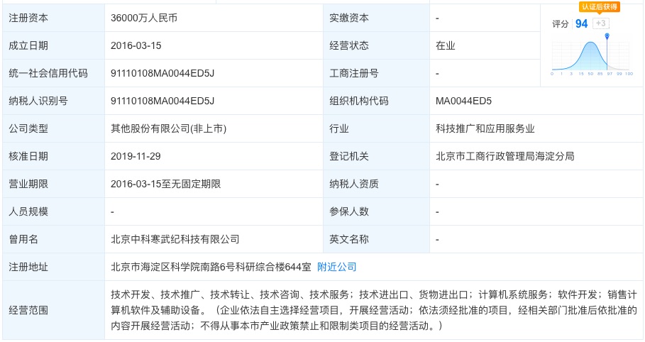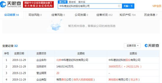 据天眼查数据显现,寒武纪的运营主体——北京中科寒武纪科技股份有限公司产生工商改变,注册资本由本来的约148万人民币新增至3.6亿人民币。