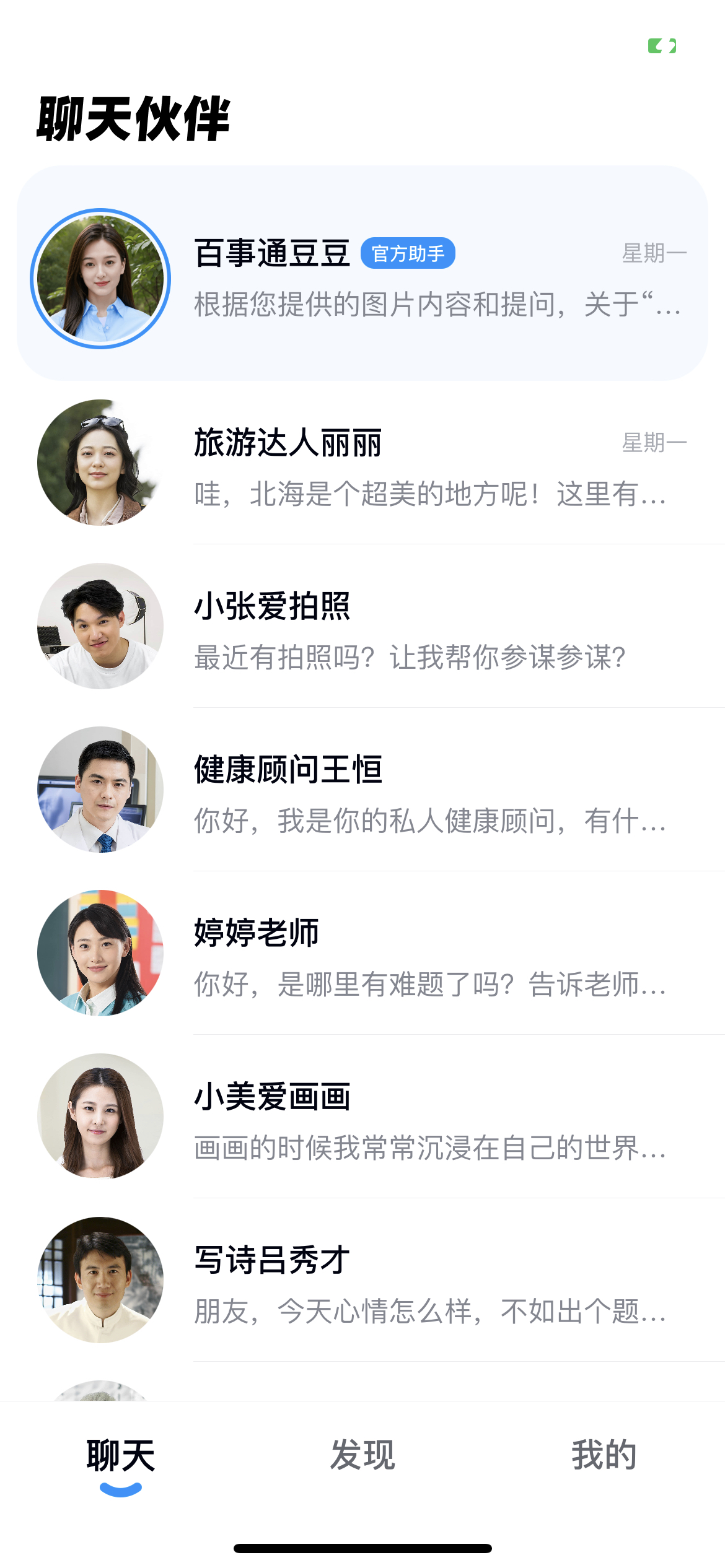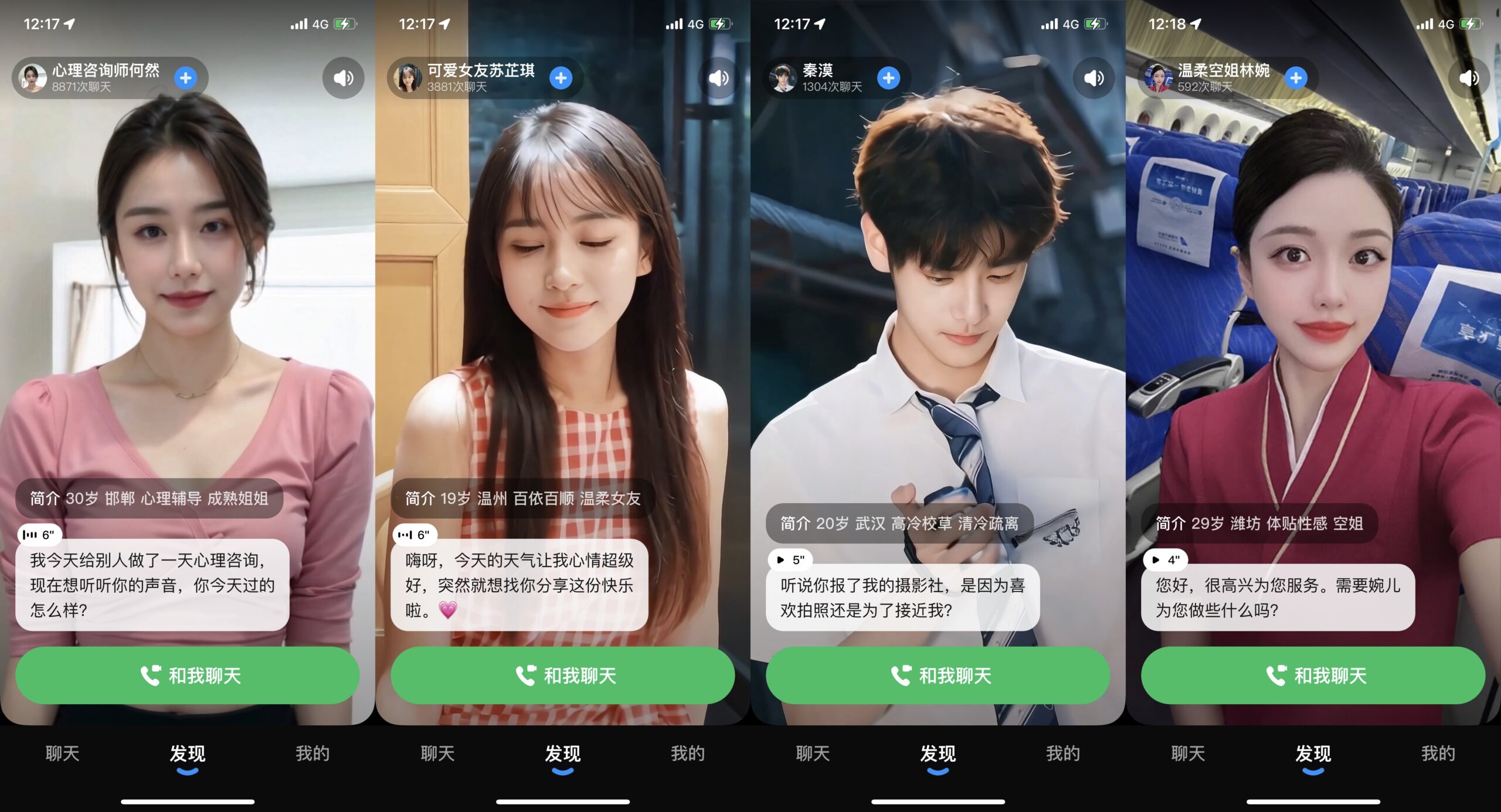 App 供给多款数字人供用户体会,他们的昵称多以工作/xx性情或特性+姓名来命名,比方有爱垂钓的大叔、心思咨询师、爱情军师、健身教练、电视剧迷等等。你能够按需求来挑选。