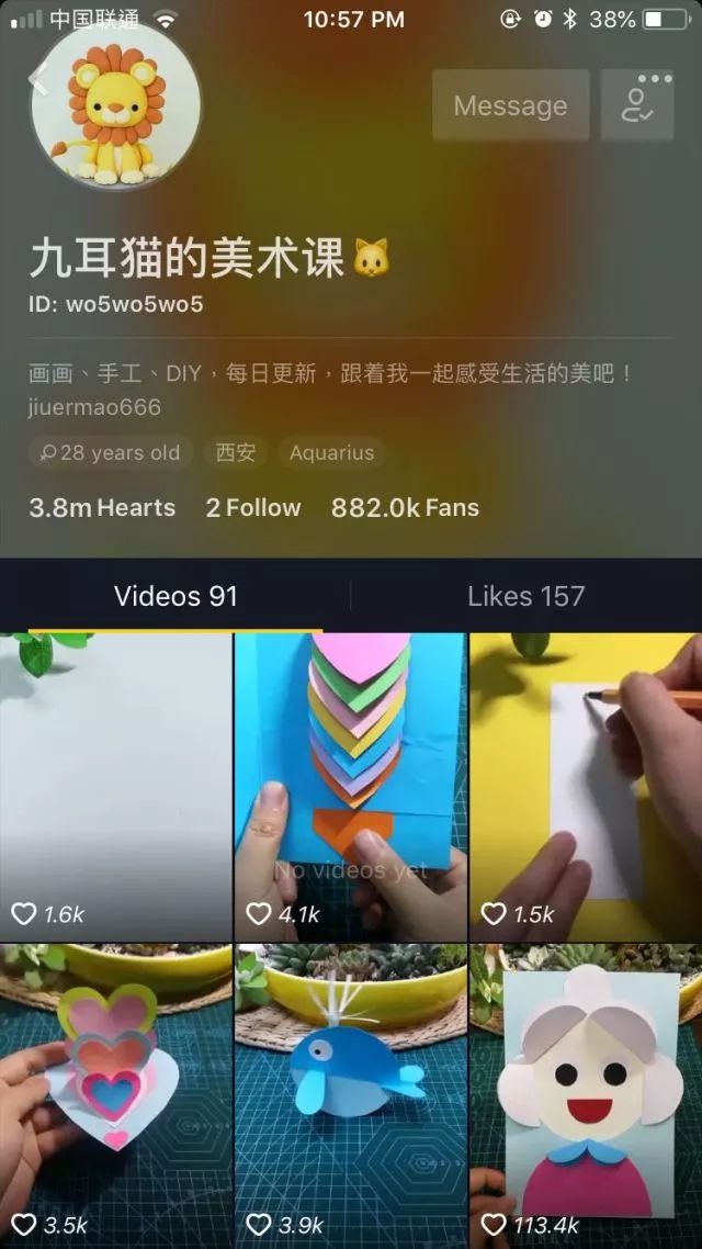 我国画系结业、现任小学美术教师的王旭阳,周末一早七点睡醒,就在摆满色笔和色纸的作业桌前开端构思今日的短视频,一向继续到下午,做做停停,一天能够产出三支充溢构思的手艺美术教育内容。他在抖音上的频道”九耳猫的美术课”(”九耳”是”旭阳”的偏旁),在 4/22 上线第一个著作,一个多月后,具有了 88 万的粉丝、370 万个爱心,他常常一觉睡醒发现粉丝数量多了 3000 人,更在 5/1 连假期间,一下增长了 20 万。